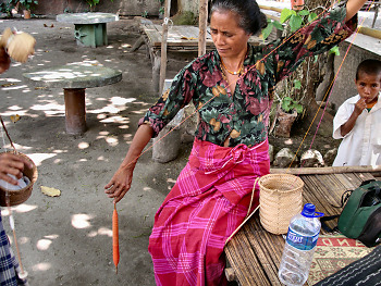 Winding Yarn in Chendjebi, BhutanThe Magic BeginsThis is the point at which I completely get left behind by the talent of those who are experts at this particular craft. Combining various colored threads into an artistic fabric is a process that I am sure I would have a hard time mastering. Weaving was developed by several ancient cultures, presumably independently, though the methods and equipment used in those regions today share the same basic principals. Using some type of a loom, two perpendicular sets of threads are intertwined into an integrated whole, in the process the desired design is included by mixing threads of various colors. Traditional looms, of various levels of complexity, may hold the finished fabric vertically or parallel to the floor. Even with the most experienced hands, the process is very time consuming. However, and this is what really amazes me, as far as I can tell, most of the ladies create their intricately designed fabrics without using the aid of any sort of pattern or template. My first encounter with the work of weavers came after I left the thoroughly industrialized land of Australia, for the more traditional island nation of Timor Leste in Stage 1. In that young nation, the fabrics produced by the local women are known as Tais. These textiles have been a traditional part of the culture there for centuries, and most of the various local regions have developed specific designs, which, to the knowledgeable eye, can reveal their place of origin. To me, however, most seemed like variations on a familiar theme of stripes. My most enlightening encounter came in the idyllic little seaside village of Com, near the eastern tip of the island. Spending a quiet afternoon weaving at the edge of the beach seems like quite a nice way to pass the time to me, though, being a male, I suppose I would be laughed at if I tried to partake in that particular activity. A girl weaves Tais fabric in Com, Timor Leste