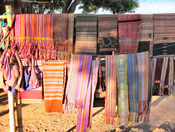 A partially finished fabric on display in CuscoThe finished products can then be used for clothing, household uses, or anything else one desires, and will add color and beauty to any community. Tais fabrics for sale in Com, Timor LesteRole ReversalIt is not uncommon to see a Made in Bangladesh label on a garment purchased in the Western World. However, such fabrics seem to be produced by more modern equipment, and in a semi-industrial setting. As such, in that country I noticed, for the only time, men involved in the production of textiles. As I rode through a small village along the otherwise treacherous Aricha Highway, I observed a few women hanging freshly dyed threads on to long poles in order to dry in the sun. Of course, that piqued my curiosity, and I hoped to be able to witness some weaving in progress by the local ladies. The clamor of working machinery drew me to some nearby buildings, and peering though the window I noticed that the procedures involved there were almost entirely mechanized and done in a setting that might have seemed familiar to Charles Dickens. The other observation I made was that all of the mechanical looms there were being controlled by men. Whether that was due to a belief that such work was unsuitable for women, or from some other cultural concern, I couldn't say. I also couldn't say that I found the methods used there to be superior to the traditional ones I witnessed elsewhere.