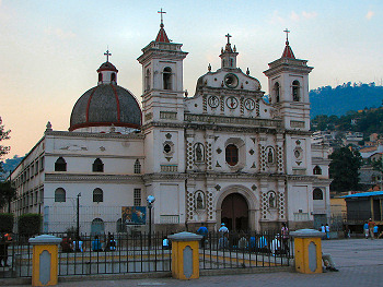 Virgen Procession in ChinandegaHonduras: Just Survive the HeatHonduras was where I left the vicinity of the Isthmus's west coast for the rougher terrain of the central mountains. That meant a relatively short climb, but one that was significantly tiring thanks to the already-high temperatures of the Central American spring. A short break in the capital, Tegucigalpa, followed, and then came a very slow ride to the north and west, though the still-hot and now-smoky highlands. The goal of that section was the Stage's first major destination, the ruins of the Mayan city of Copan, the first of nine ruins sites I would see during subsequent weeks. That site, by itself, made a visit to the country, and the exhausting riding that it entailed, worthwhile, and provided an excellent introduction to the Mayan region. Iglesia los Dolores in Tegucigalpa