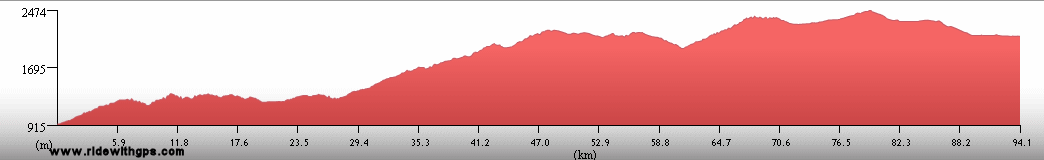 Terrain: 380-m climb, broken by small descent and rolling section; one small descent; one small climb/descent; light rolling to flat, with gradual decline; one small climb