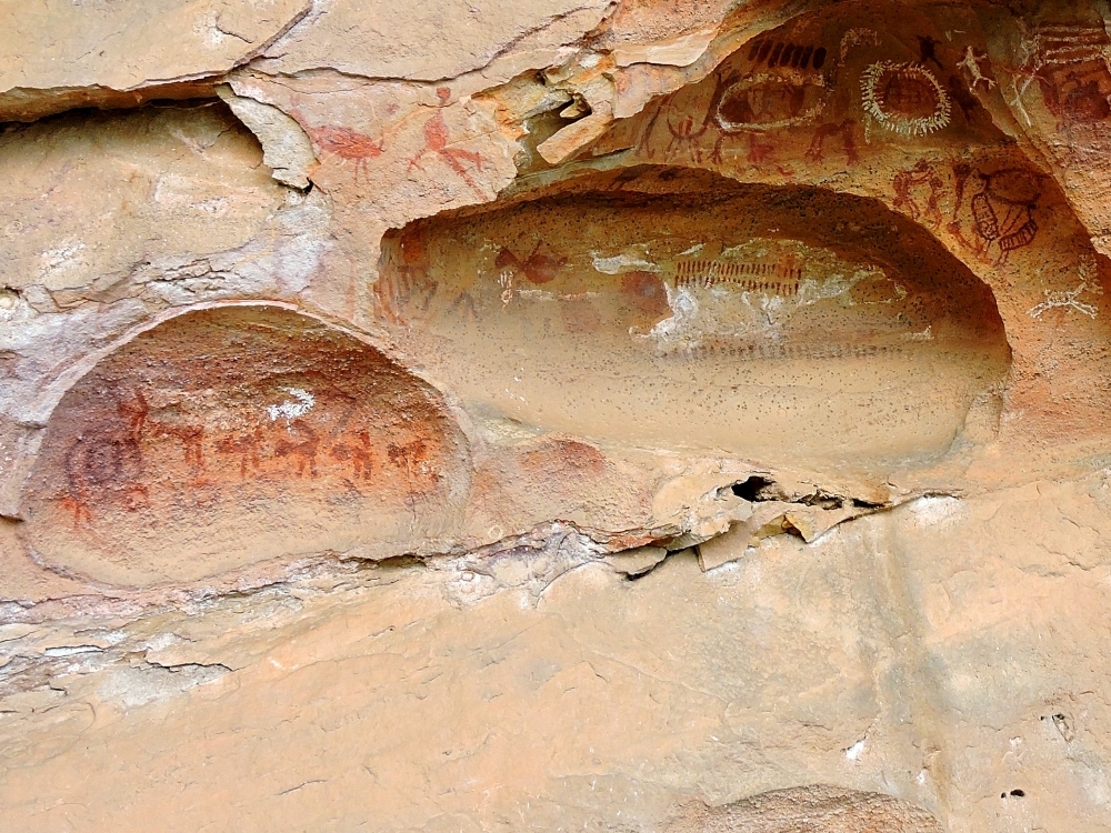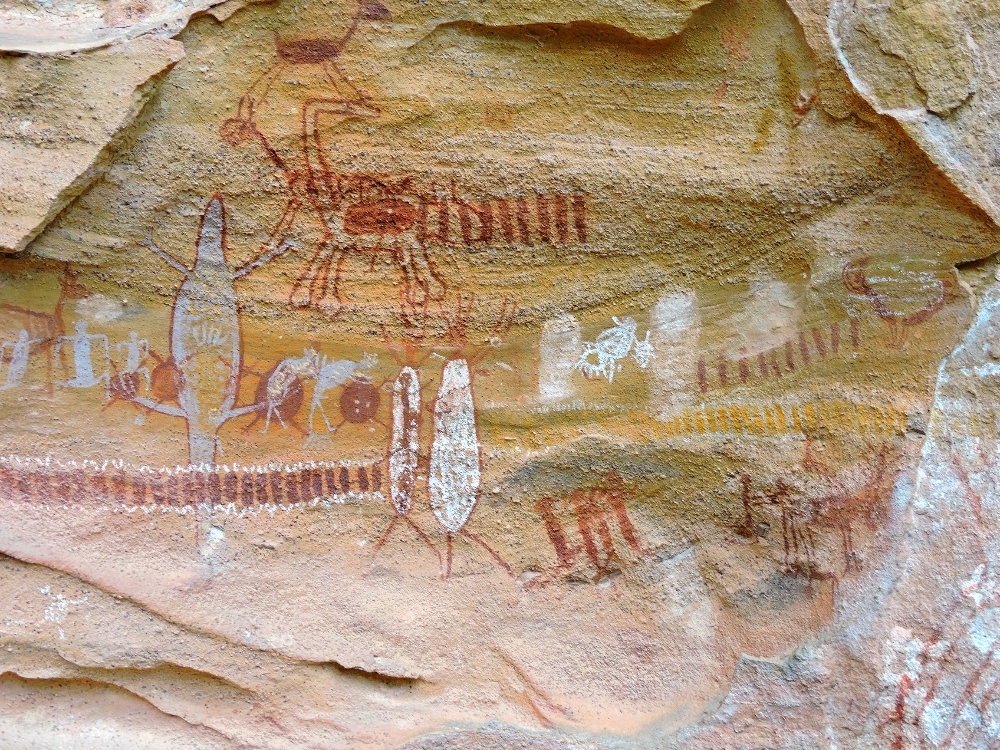 Animals feature prominently, as they often do in pictograph sites around the World, but perhaps even more so at this location. In fact, several animal images are thought to represent megafauna species that went extinct at the end of the Pleistocene Age, probably around the same time that humans arrived in this area. The image below, seems to be such a case, but I think the second image looks more like it contains a capybara and a tapir, two extant species found in modern South America.